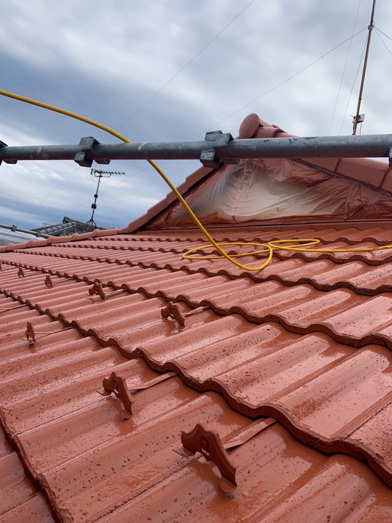 今日は屋根上塗り吹き付けです。雨が続きまいりました。